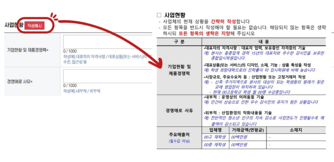 >> 사업현황을 작성합니다. 작성예시를 통해 잘 모르는 부분은 참고하여 서류를 작성합니다.