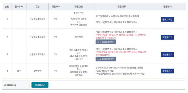 법인기업의 경우는 기업신용정보조회동의서를 출력한 후 대표자서명 및 법인 인감을 날인하여 제출합니다. 법인 공동대표자의 경우는 개인신용정보조회동의서를 출력한 후 공동대표 모두의 자필서명후 제출합니다.