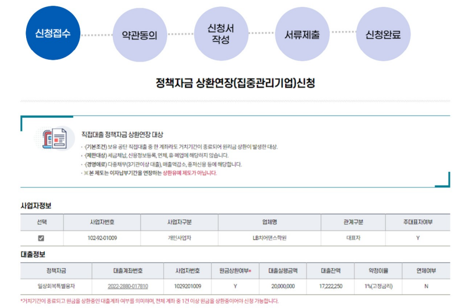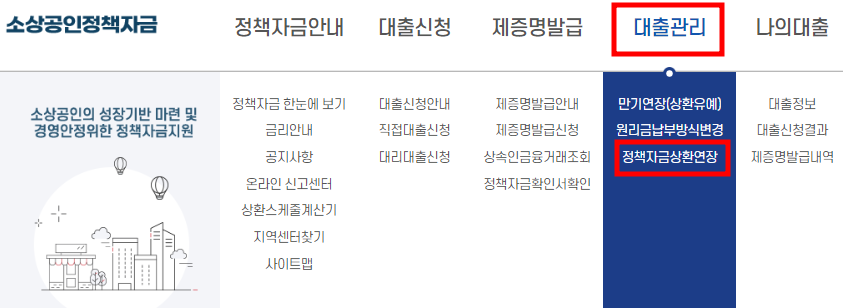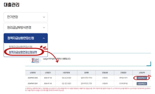 그 다음 대출관리 탭에서 정책자금 상환연장 메뉴를 확인합니다.