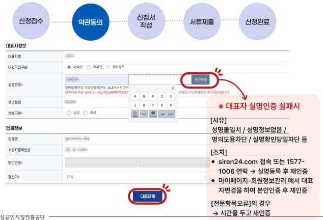 만약 대표자 실명인증 실패시의 사유가 [성명불일치/ 성명정보 없음/ 명의도용차단 / 실명확인당일차단 등]의 경우 siren25.com이나 1577-1006으로 전화하여 실명등록 후 재인증을 실시합니다. 혹은 마이페이지에서 회원정보관리 대표자변경을 하고 본인인증 후 재인증을 합니다.