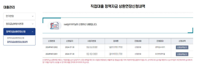 >>대출관리-정책자금상환연장-정책자금상환연장신청결과 를 통해신청내역을 확인합니다.