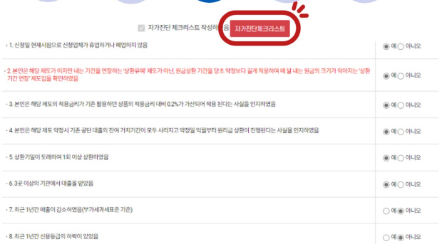 항목 1~5는 모두 "예"가 항목6~8은 하나만"예"에 해당하면 진행이 가능합니다.