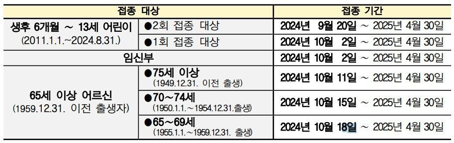 - 1회 접종 대상 어린이 및 임신부: 2024년 10월 2일 ~ 2025년 4월 30일